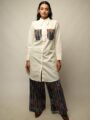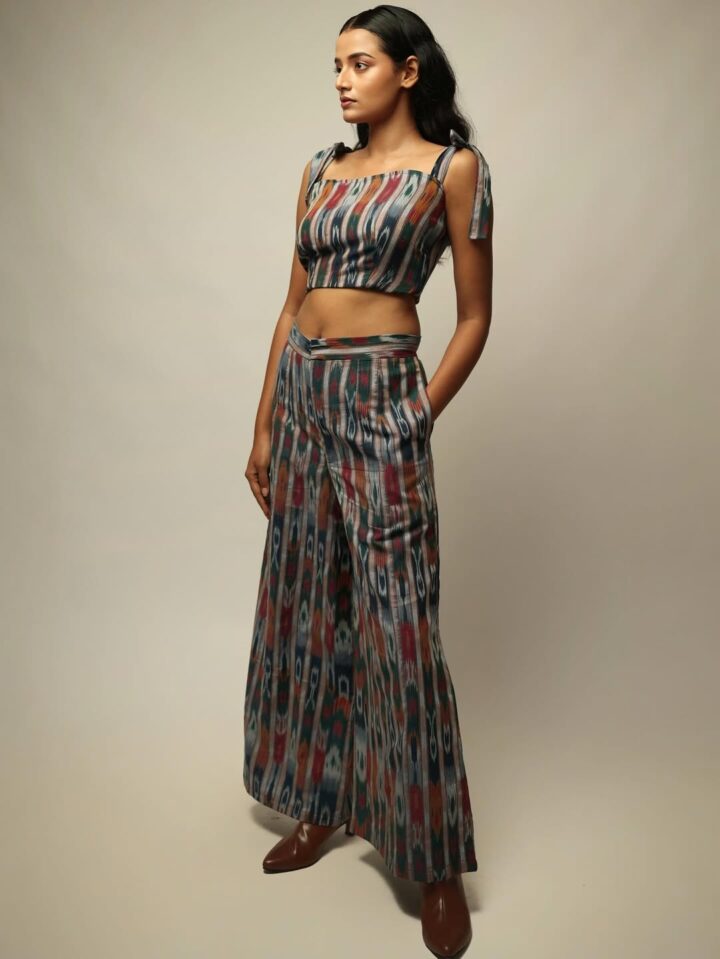 This trouser enhances your whole collection look when matched with, the wrap around skirt worn as top, Shoulder strap top or Khadi Shirt Dress.