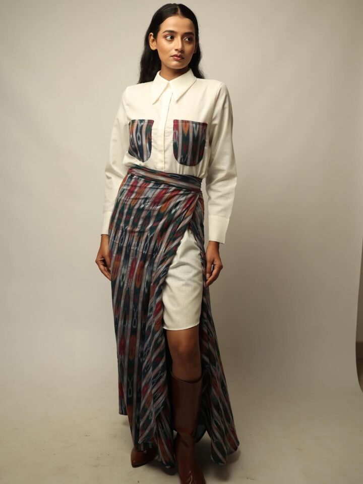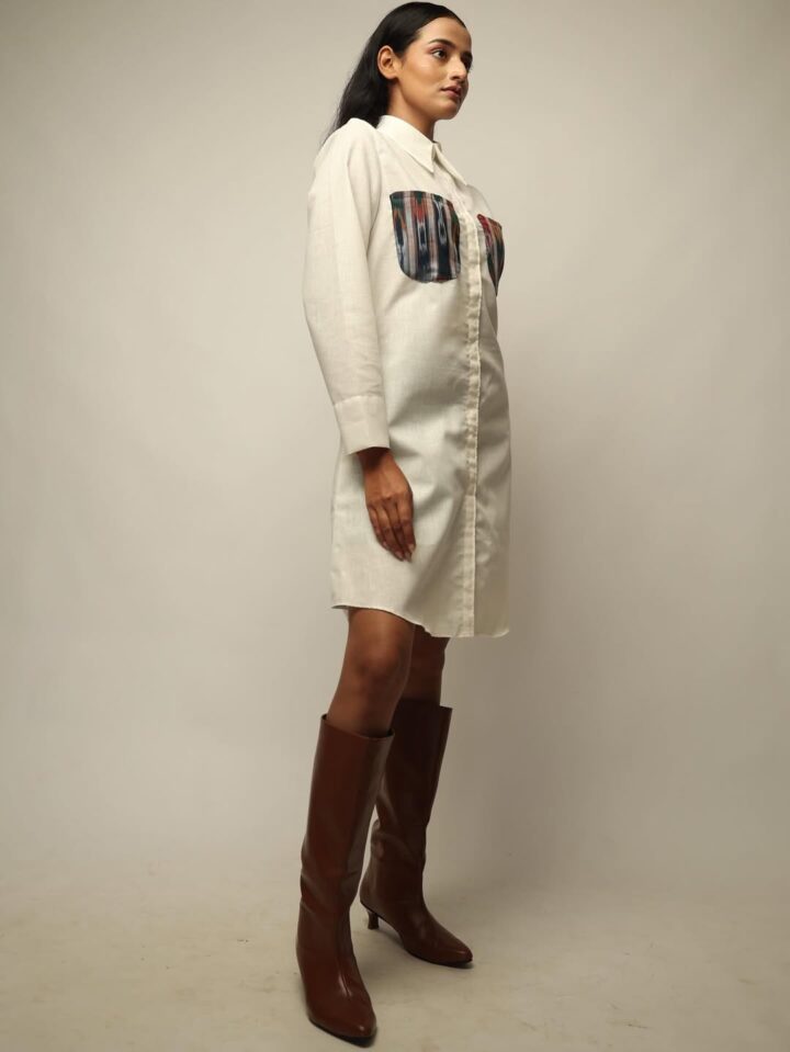 Khadi Shirt Dress with Ikkat Patch Pockets